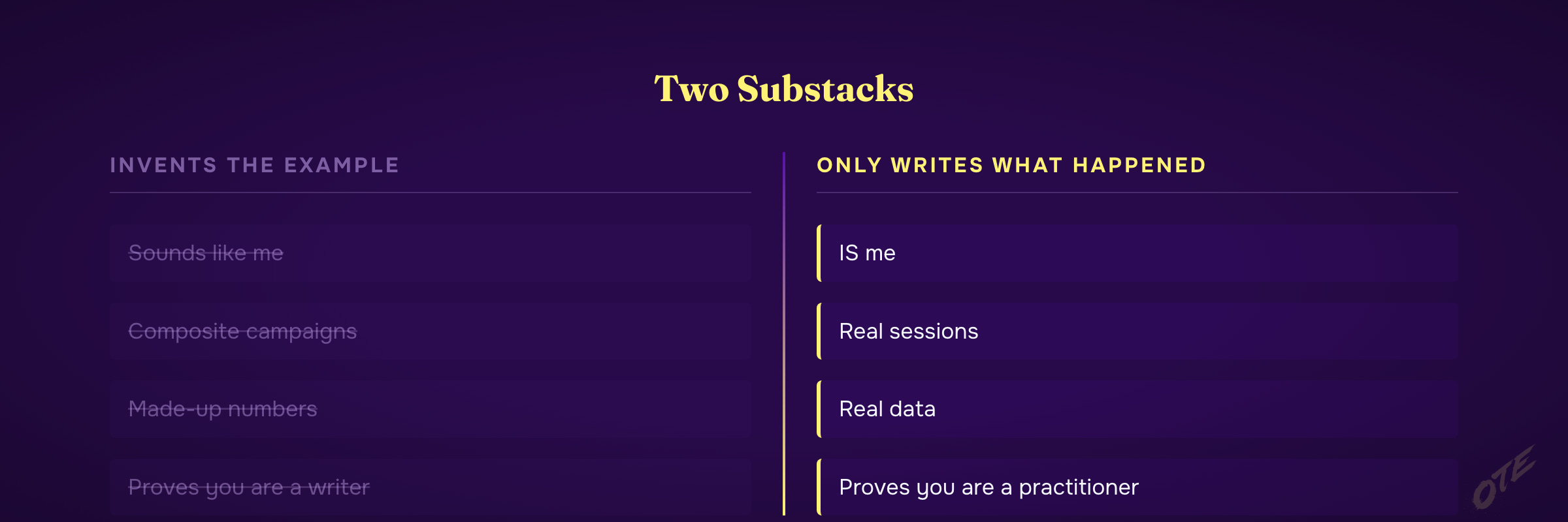A Substack that invents the example proves you're a writer. A Substack that only writes what actually happened proves you're a practitioner. Those are different products. Only one is worth reading.
