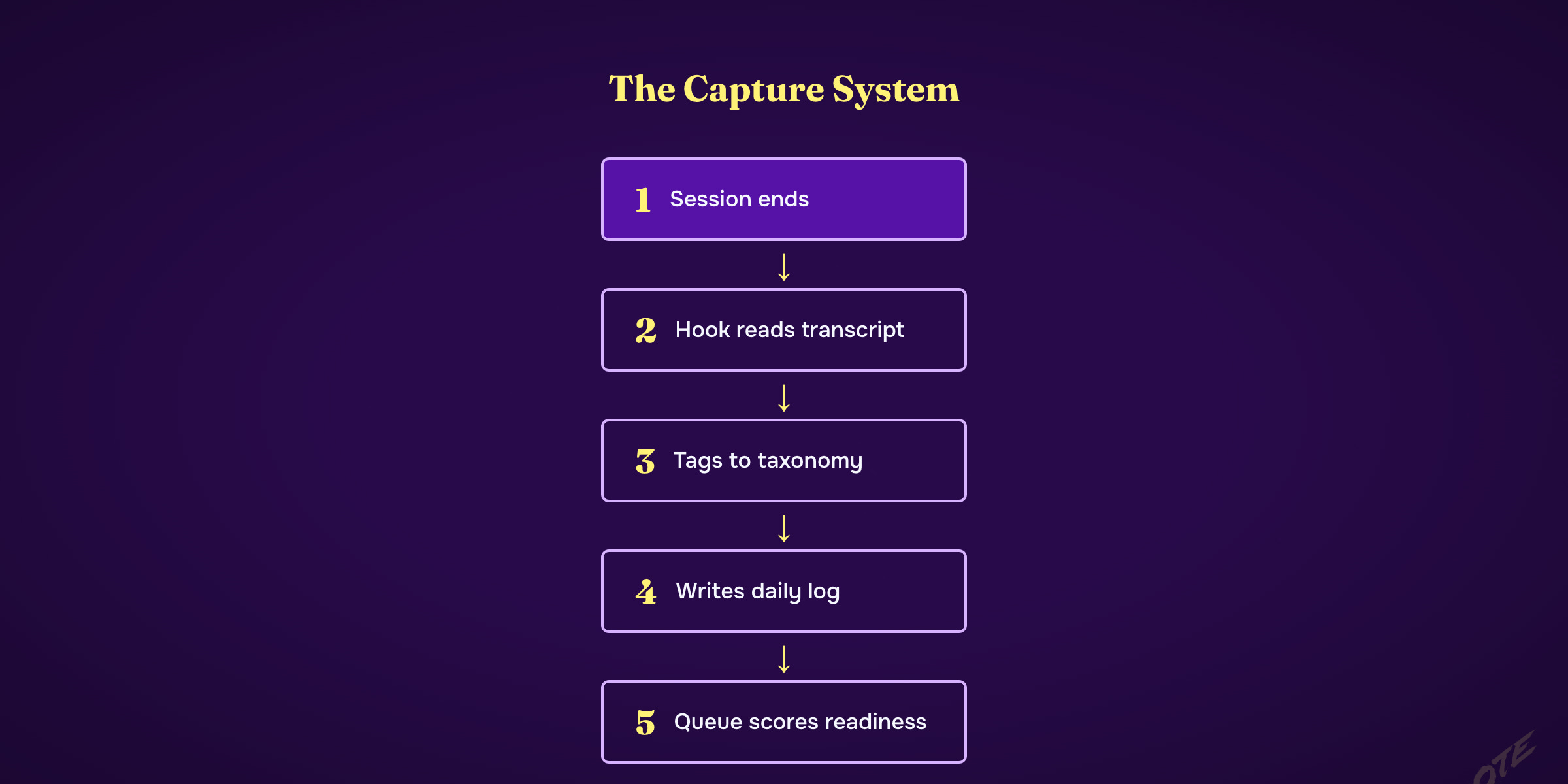 I built a Claude Code hook that fires every time a session ends. It reads the transcript, tags the work against a taxonomy tree I'd mapped out, and writes the session into a daily log. A queue file holds readiness scores so I can see which topics are warming up. Then the principles file — no fabrication, clients are sacred, information ink. A section and topic tree. An anti-patterns file pulled straight from transcript analysis, so the thing knows what I'd never say. Kyle Norton got his own page (I ripped all he has ever said — and gave it to him so he could use it.)